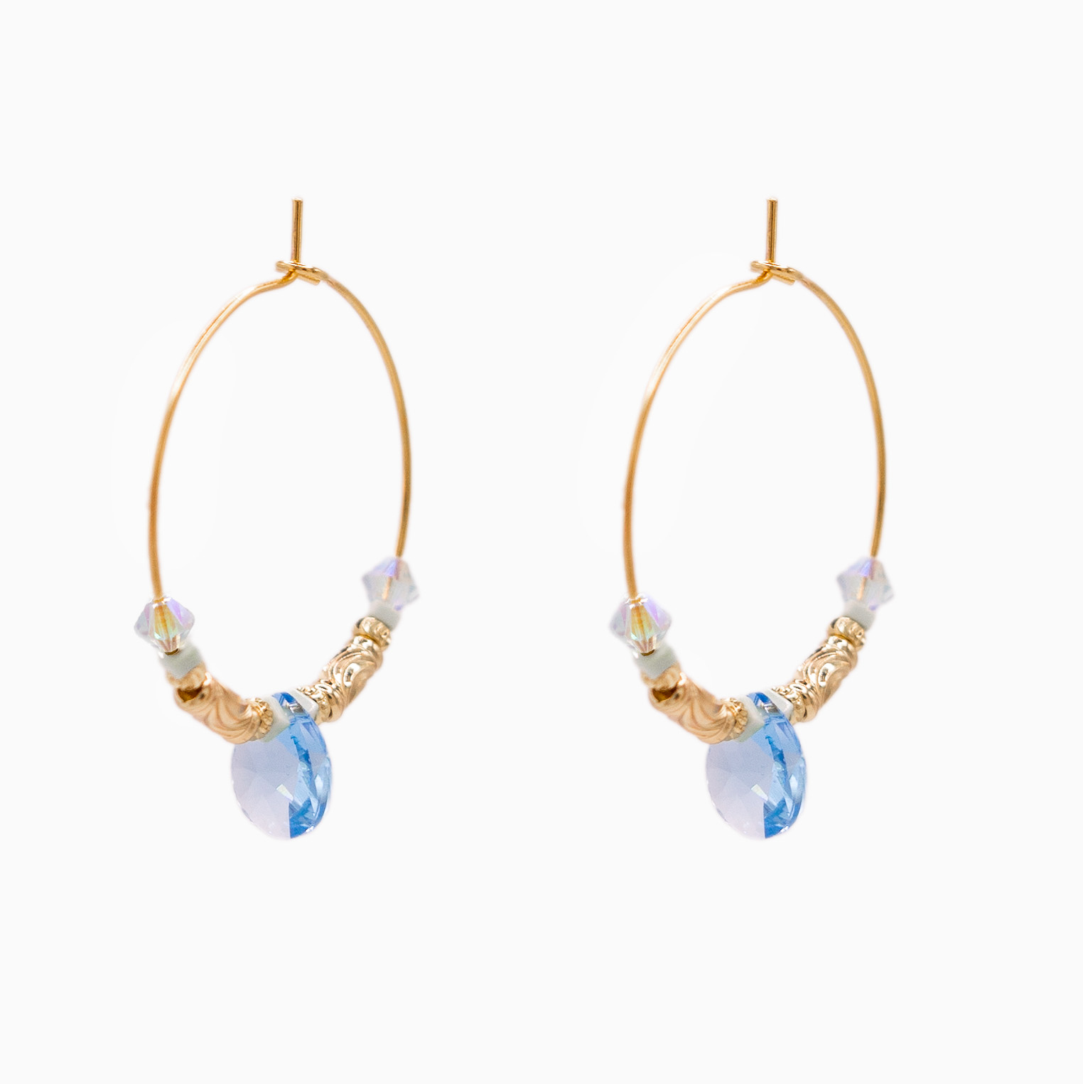 Inspired by the gentle rhythm of the Atlantic Ocean, the Atlantic Drift Swarovski Drop Hoops are a refined blend of movement, colour, and light. Handcrafted in Ireland, these elegant earrings feature soft aqua tones, sea-inspired blues finished with warm gold accents and sparkling Swarovski Crystals.