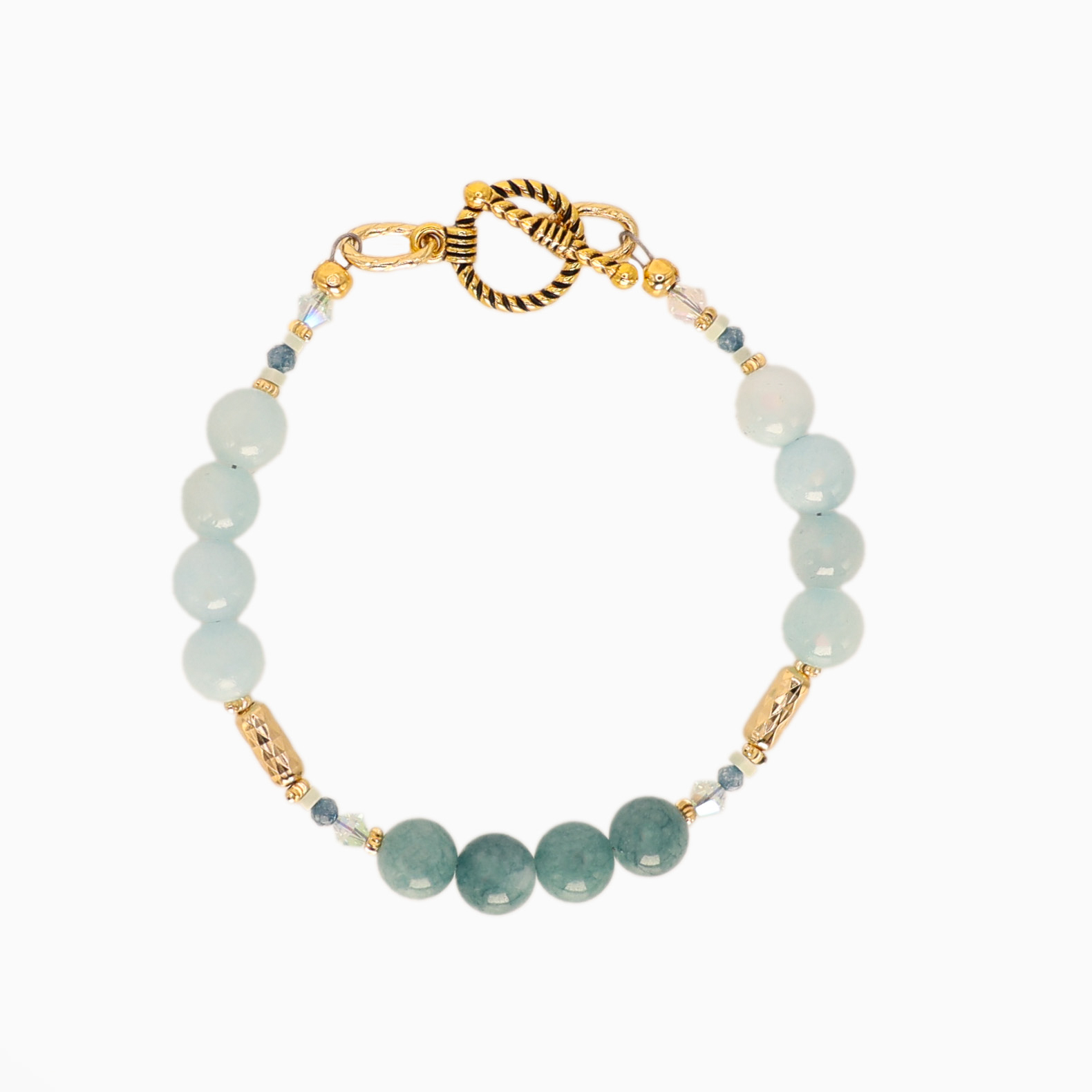 Inspired by the ever-changing movement of the Atlantic Ocean, the Atlantic Drift Stone Bracelet is a statement in effortless elegance. Designed and handcrafted in Ireland, this layered piece blends luminous blues, soft aquas, and organic pearls with warm gold tones and sparkling Swarovski Crystals— creating jewellery that feels fluid, natural, and timeless.