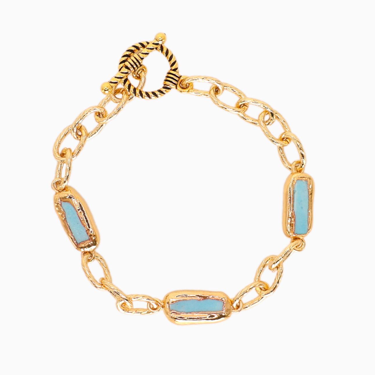Each turquoise bracelet is carefully composed using a curated mix of semi-precious stones, freshwater pearls, and gold-plated detailing, resulting in a design that moves beautifully with the body. Worn alone or layered, Atlantic Drift captures the calm strength of the sea and the artistry of Irish handcraft using 14 carat gold plated chain.