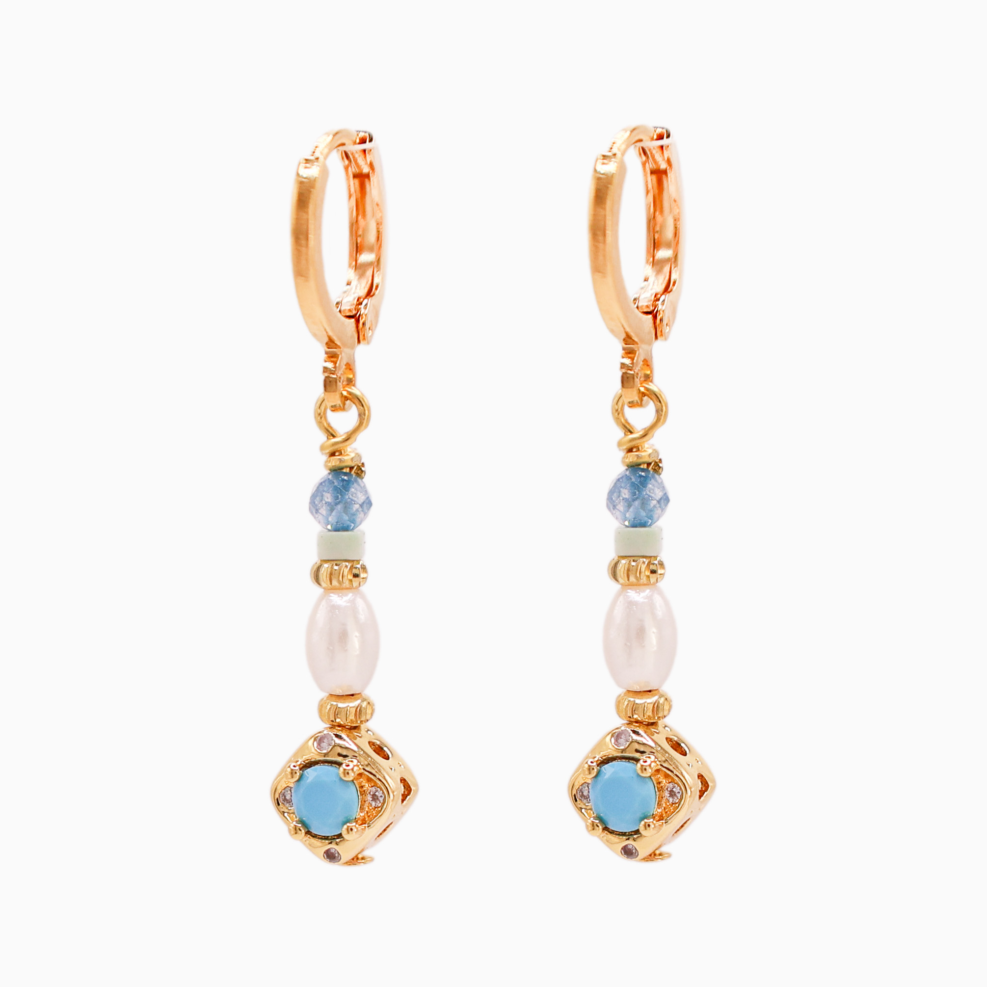 Inspired by the gentle rhythm of the Atlantic Ocean, the Atlantic Drift Turquoise Earrings are a refined blend of movement, colour, and light. Handcrafted in Ireland, these elegant earrings feature soft aqua tones, sea-inspired blues finished with warm gold accents, luminous freshwater pearls and sparkling Swarovski Crystals.