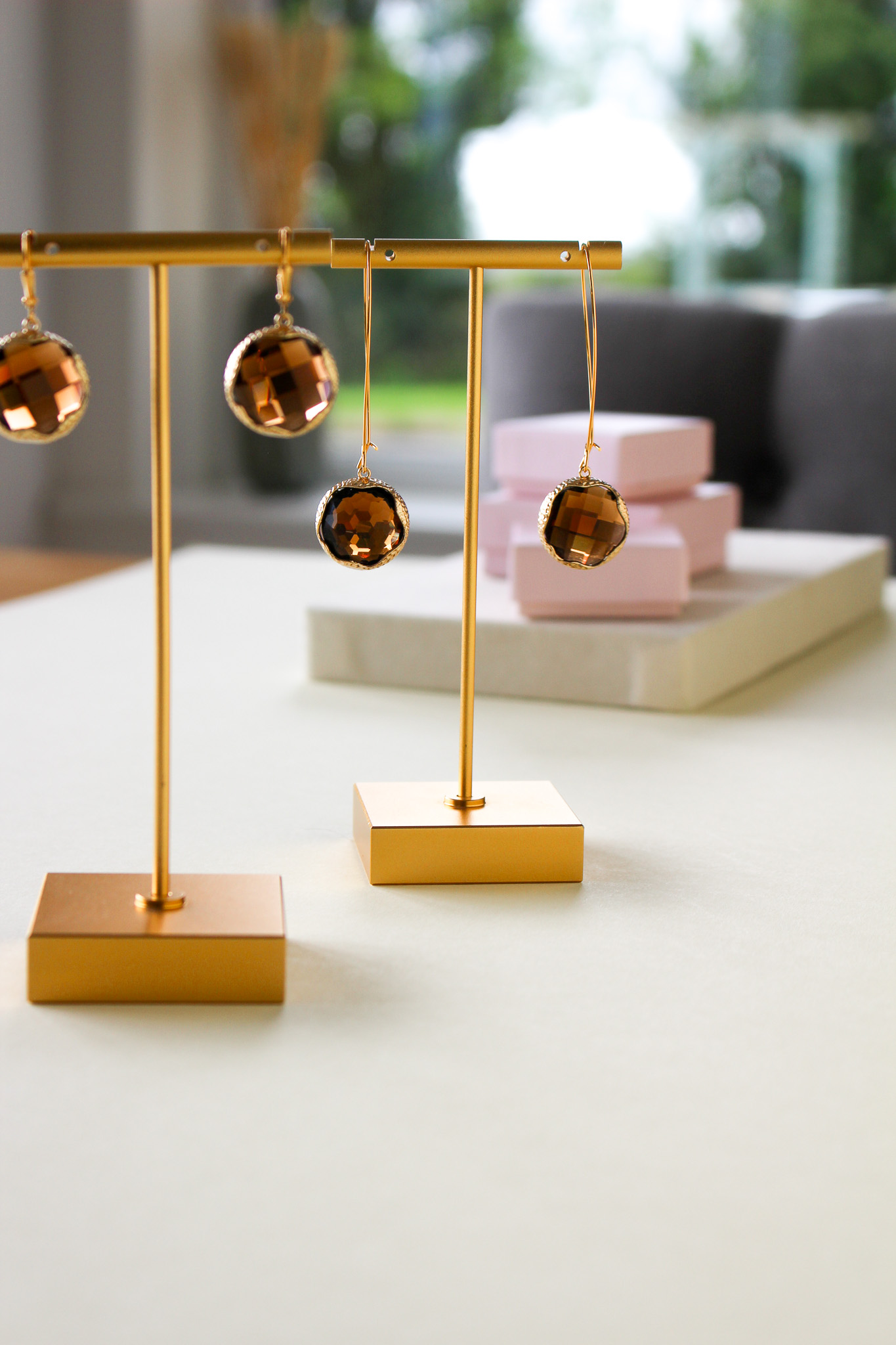 Gorgeous mocha glass stones with brushed metal accents, great versatile earrings for any occasion.
